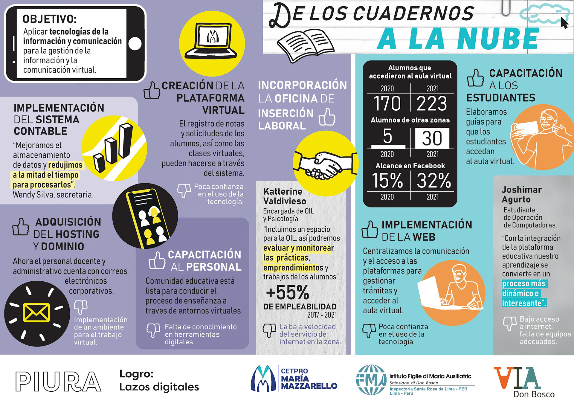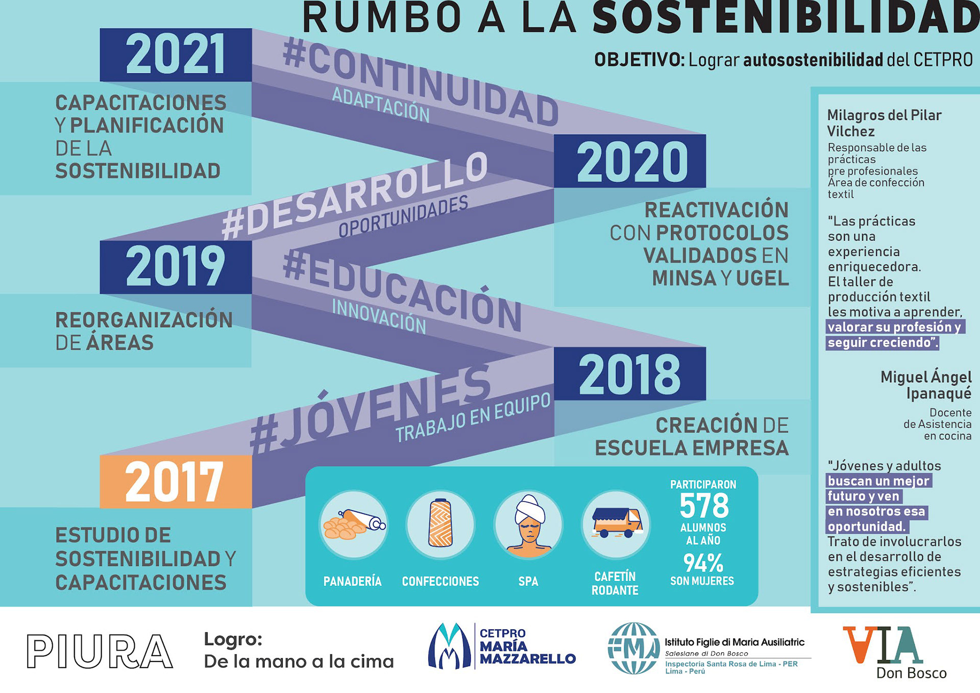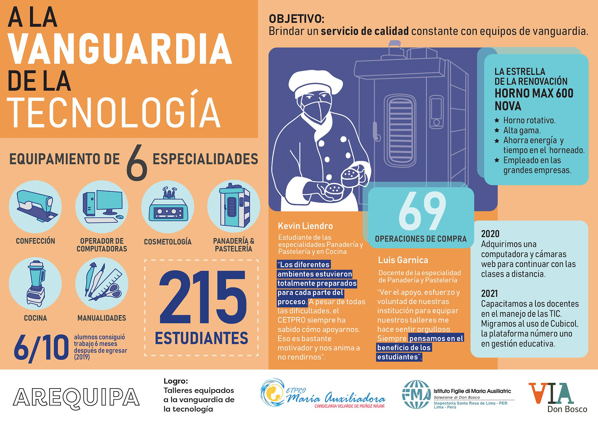 (10/2021) VIA Don Bosco es una organización no gubernamental sin fines de lucro con sede en Bélgica que este 2021 concluyó sus proyectos de cooperación en Perú con el Instituto de las Hijas de María Auxiliadora. Esta congregación trabaja con distintos Centros de Educación Técnico-Productiva (CETPRO) de distintos puntos del Perú financiando la formación técnica de jóvenes y adultos de sectores vulnerables.