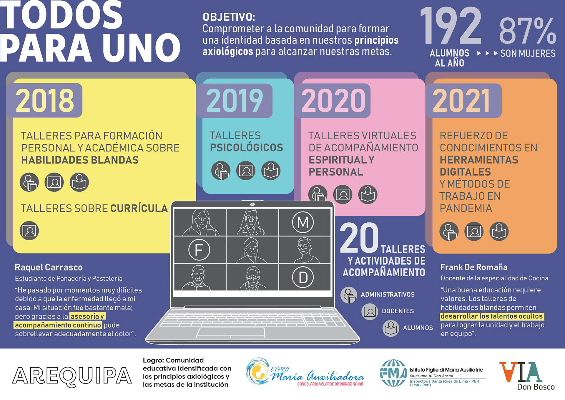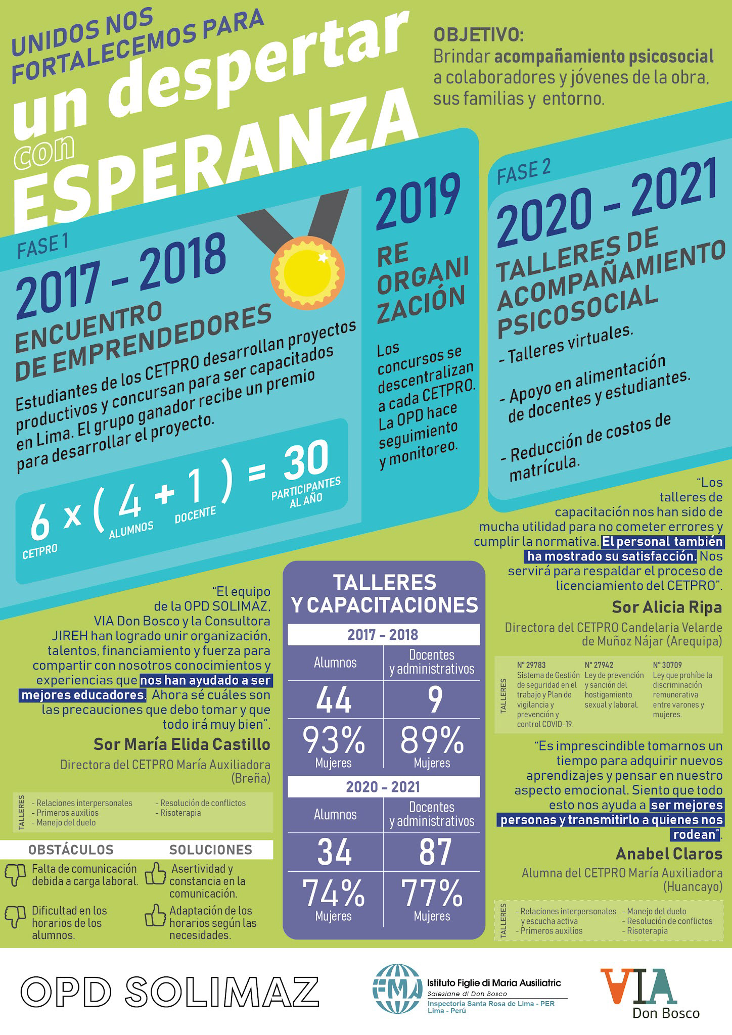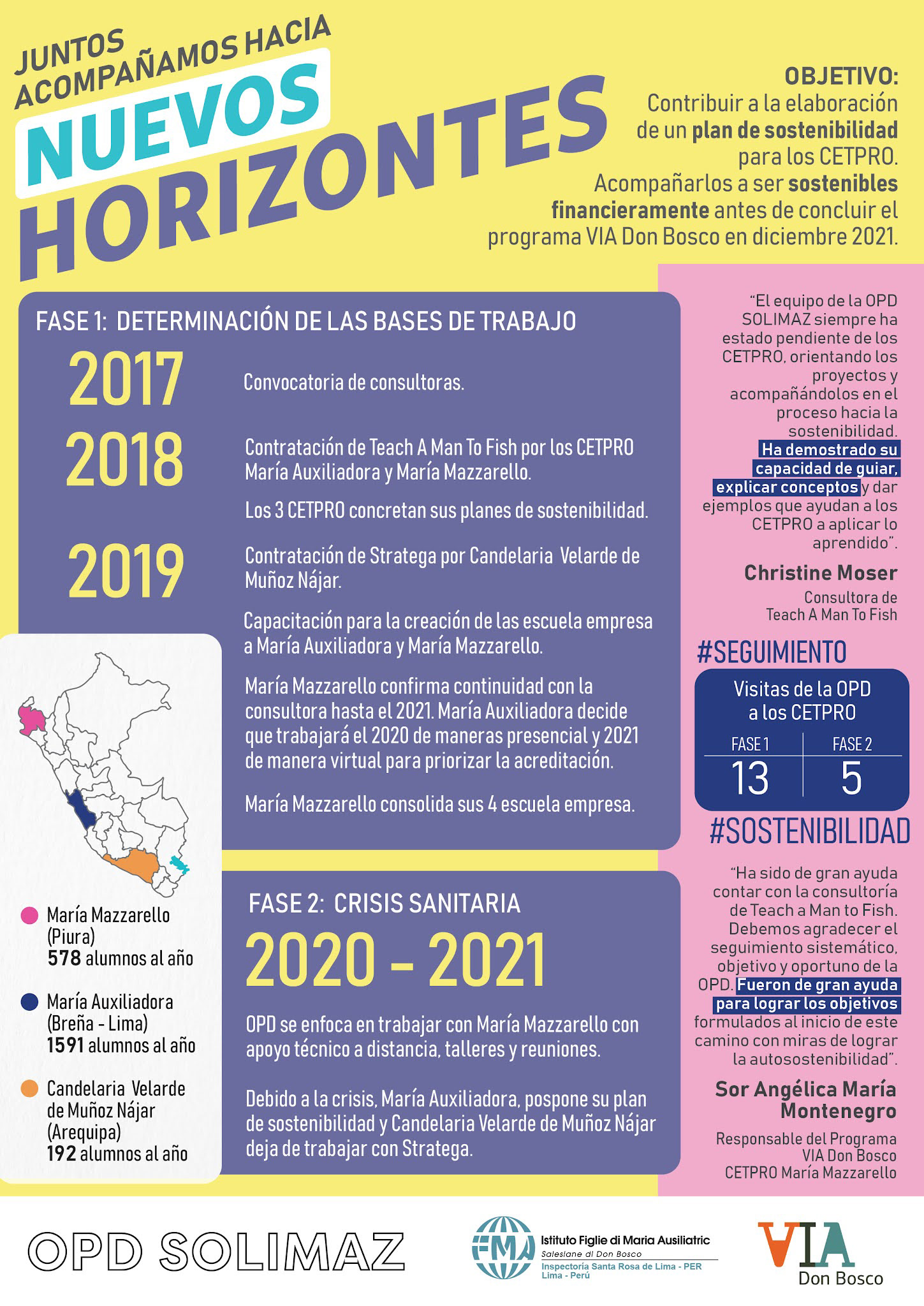 (10/2021) VIA Don Bosco es una organización no gubernamental sin fines de lucro con sede en Bélgica que este 2021 concluyó sus proyectos de cooperación en Perú con el Instituto de las Hijas de María Auxiliadora. Esta congregación trabaja con distintos Centros de Educación Técnico-Productiva (CETPRO) de distintos puntos del Perú financiando la formación técnica de jóvenes y adultos de sectores vulnerables.